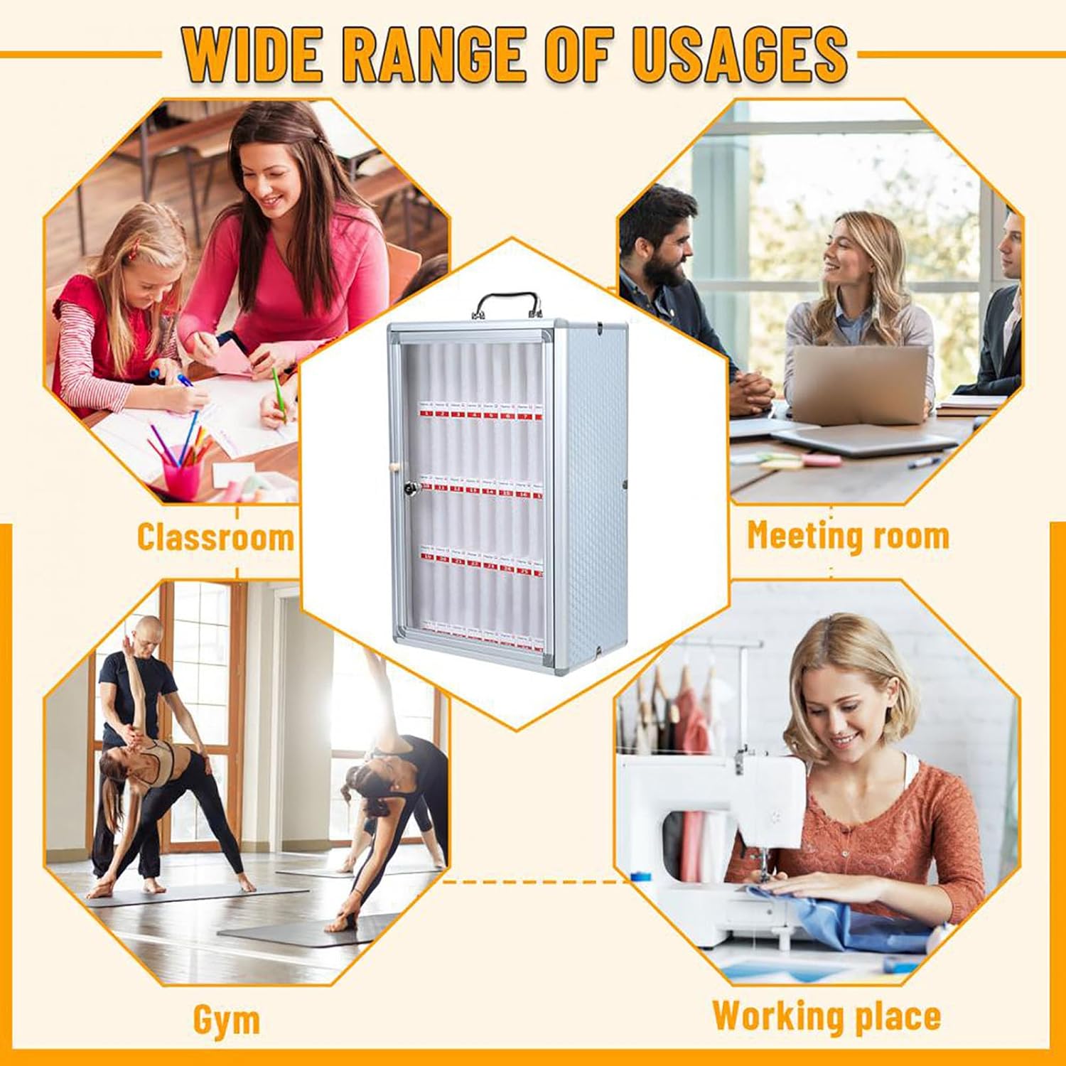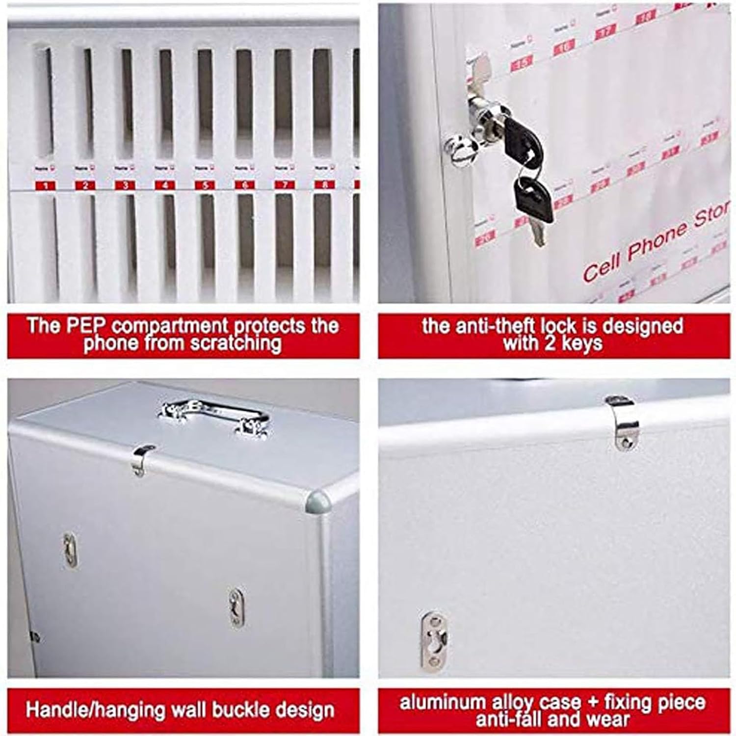 Aluminum Alloy Cell Phone Storage Cabinet for Secure and Organized StorageProduct Specifications:Color: SilverCabinet Door Material: AcrylicBorder Material: Aluminum alloyLining Material: Pearl Cotton CompartmentPanel Material: Paint MDFAdditional Features: Wall-mounted optionSecurity Method: Key LockShape: RectangularProduct Features:Equipped with a hardware safety lock and stainless steel rounded corners to prevent damage and ensure device safetyFeatures an ergonomic silver-plated handle for comfortable carrying and the option to be placed on a desktop or wall-mountedSuitable for schools, conference rooms, beauty salons, training centers, troops, laboratories, and sealed workshops. Easy to clean and supports various cell phone modelsPackage Included:1* Aluminum Alloy Cell Phone Storage Cabinet2* Keys4* ScrewsNotes:Please allow for slight color differences due to lighting and a 1-3cm measurement error. Ensure these are acceptable before ordering