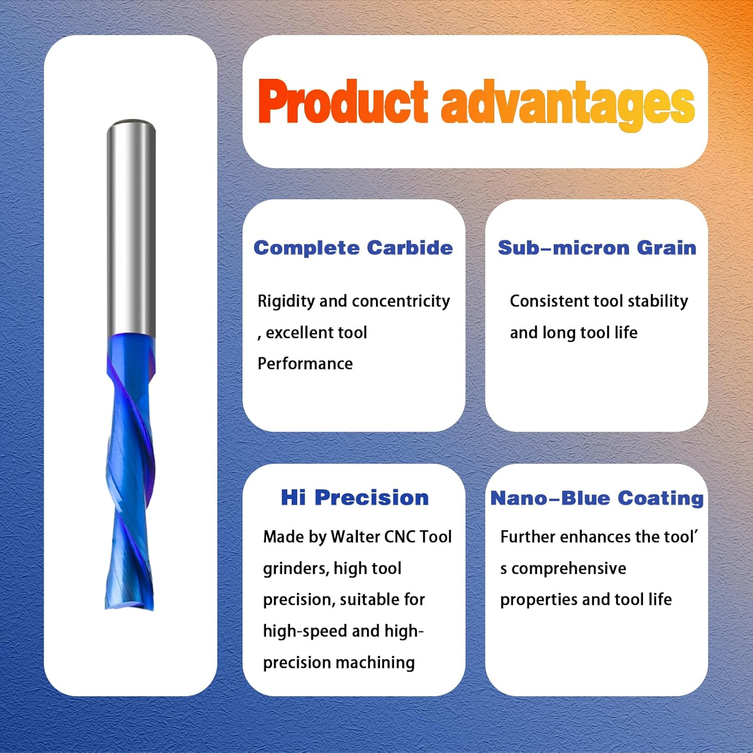 Product Specifications: Cutting Diameter: 1/4 Inch Cut Length: 1 Inch Shank: 1/4 Inch Overall Length: 2-1/2 Inch Flute: 2 Spiral Flutes Material: Solid Carbide Coated: Nano Blue Coating Details: 100%/Complete Carbide Rods and Blanks Very good rigidity and concentricity, make the tool excellent in tool Performance Sub-micron Grain Carbide Materials The High purity Sub-micron Grain Carbide grade guarantee consistent tool stability and tool life High Precision Machined by Imported Walter CNC Tool grinding Machines, be of very high precision, suitable for high-speed and high-precision machining Nano-Blue Coating Coupled with the protection and excellent features of the Blue Nano Coating, with further enhances the tool’s comprehensive properties