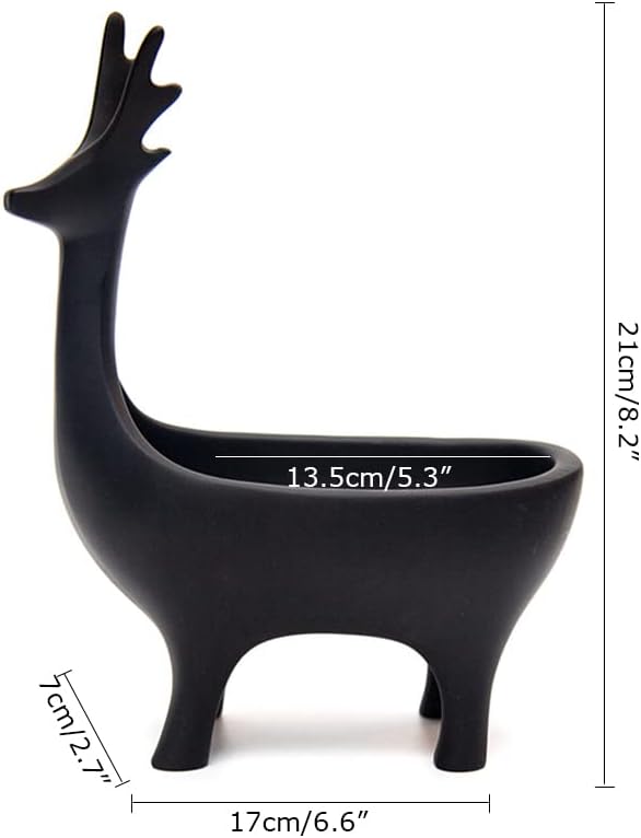BOOMLATU Creative Resin Deer Statues Jewelry Tray Key Tray Organizer for Entryway,Table, Home,Bar and Office Feature: This is a deer figurine, modren and simple design. Cute Deer Statue is not only storage some small things but decorate your home space and increase your home more fashion and beauty. It is suitable for living room, bedroom, entrance, office and other interior spaces.It has a large storage space, great for holding keys, wallets, phones and other small accessories. Specification: Material:Resin Overall size:17x7x21cm/6.6x2.7x8.2inch(LxWxH) Storage size:13.5x7x4.5cm/5.3x2.7x1.7inch(LxWxD) Weight:0.8 lbs Package includes: 1*Jewelry Tray Warm Note: Please allow a little difference in size due to the manual measurement. Due to spotlight problems, there may be slight differences in color. If you have any question with the product, pls contact us in time, we will solve the problem for you ASAP.