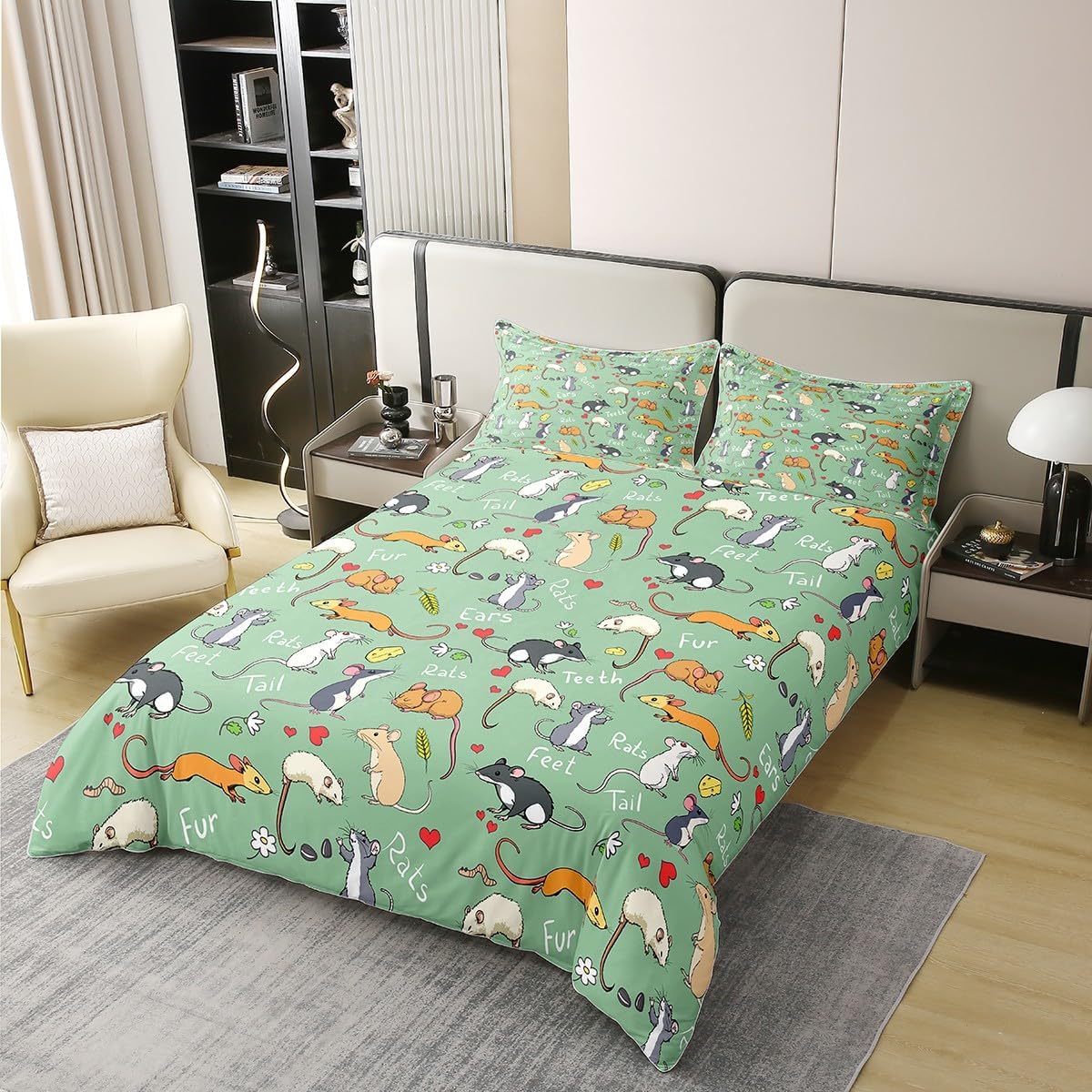 Erosebridal 100% Cotton Kids Rat Bedding Set, Mouse Rodents Duvet Cover Twin, Funny Animal Love Heart Comforter Cover for Boys Girls Children Bedroom, Cartoon Style Quilt Cover Decorative Room, Green
